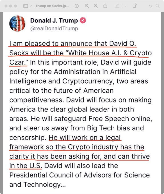 上图是川普发表 Sacks 任命的推文。除了第一句话的正式任命外,还很值得注意的是下面一句话,川普任命了 Sacks 负责制定 Crypto 行业一直以来寻求的法律监管框架。其实很多人不知道的是,Sacks 除了周所周知的硅谷科技大佬身份,他的正经教育背景其实是 芝加哥大学法律博士,所以他负责制定 Crypto 法律框架可谓是出身根正苗红。而美国的 Crypto 法律又牵涉到全世界包括中国的 Crypto Builder,所以 Sacks 这个人今后对于 Crypto 的观点言论是非常重要且值得关注的!👀