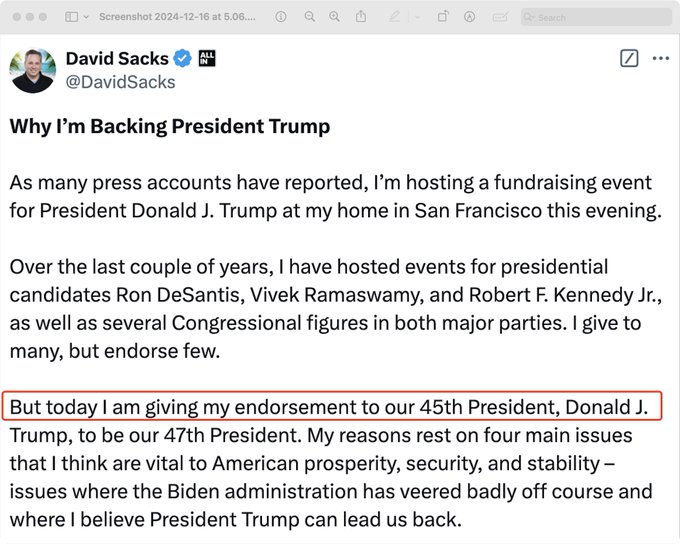上图雄文发表于今年 6 月 7 日,在川普正式当选之前一直主页置顶,目前已获得 1100 万阅读,链接如下:https://x.com/DavidSacks/status/1798883245670707465.