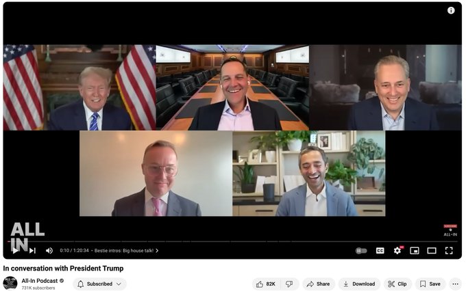 • All-In 播客邀请川普来作为客座嘉宾,并公开表示支持。
