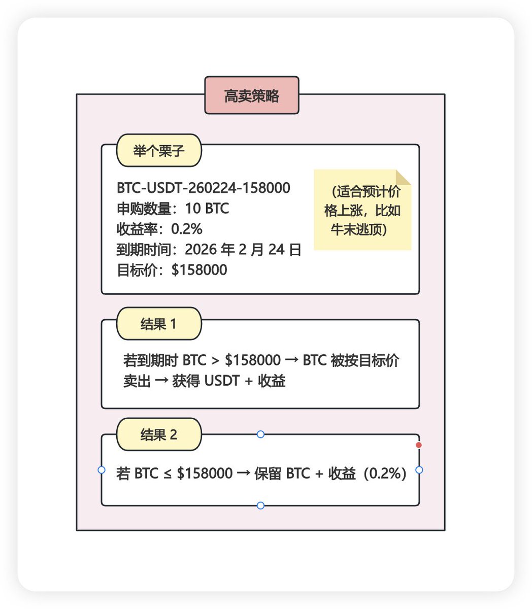 简单来说,就是你可以选择在未来某一时间点,以目标价格买入或卖出某币,并在此过程中赚取额外的年化收益。