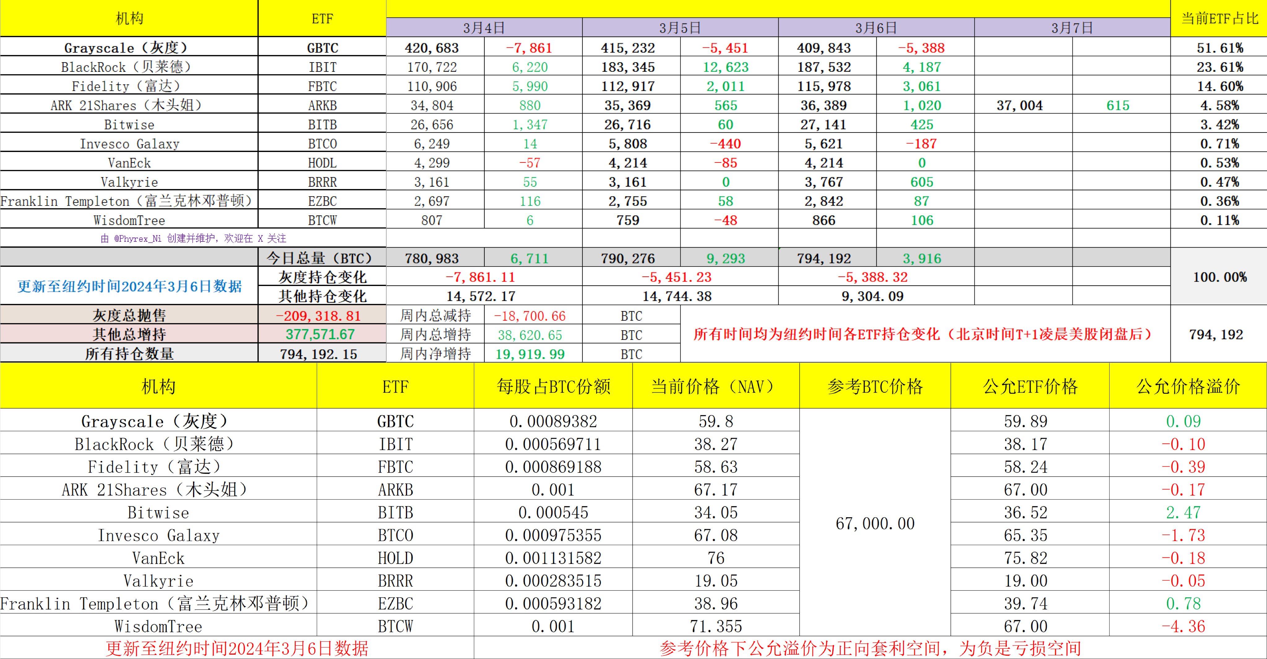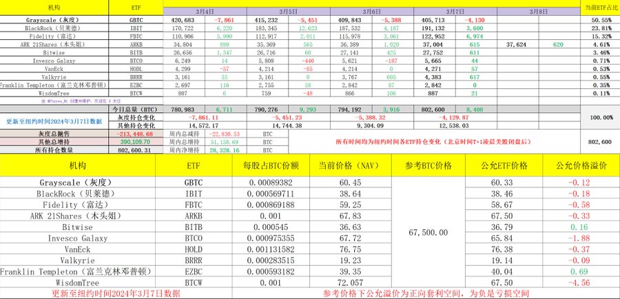 最近24小时的BTC现货ETF数据来看,有些休整的趋势了,虽然最近24小时价格更加稳定一些,但确实没有看到像以往一样大幅买入的趋势,尤其是对于最头部的贝莱德来说,最近24小时的净买入量已经低于最近两周的均值,但,相比于两周前的数据来说,这个买入量是属于正常的范畴。 除了贝莱德以外,同样处于第一梯队的富达表现的就稍微好一些,近24小时的增持量也超过了前一日,这也使的贝莱德和富达的总 #BTC 持仓量超过了30万枚,按照目前的市值来看,已经达到了201亿美元,这还仅仅是两支ETF的总和。 第二梯队的木头姐不知道是不是又在自己买入了,近24小时增持回到了四位数,目前总管理的BTC也超过了36,000枚,排名第四的Bitwise也有一定的增持,从总的趋势来看只有景顺的BTCO是除了GBTC以外有明显流出的,其它的八支基金都是在正向流入。 截止到目前十支现货ETF的机构总持仓BTC是794,192枚,除去灰度的GBTC仓位外,384,349枚BTC,这个数据是我们熟悉的 MicroStrategy 持仓量的将近两倍,当前总市值是257.5亿美元。 虽然随着价格的升高目前流动中的 #BTC 数量在提升,但随着ETF机构的不断购买,很有可能会接下来的一段时间会开始降低市场中的流通量。当然了即便是现在数据有些下降,但仍然能看到美国的机构投资者仍然在买入BTC。 数据已更新,地址:docs.google.com/spreadsheets/d
