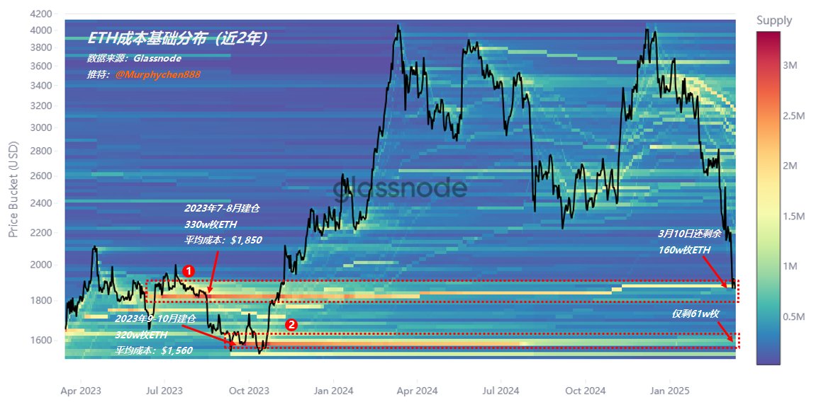 接下来,我们将时间跨度拉长,来看下更早期的投资者们的持仓成本和行为表现。在标注1的红色虚线框内有一群地址在2023年7-8月开始建仓,高峰期持有近330w枚ETH,平均成本在$1,850左右。随着ETH涨到$4,000又跌回$1,860的整个过程都在逐步卖出,到3月10日还剩余160w枚ETH(然后又在3月13日开始加仓,目前持有212w枚ETH)。
