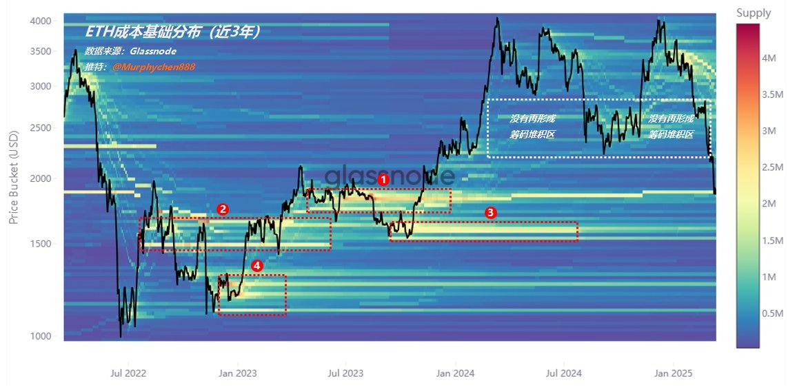 图1是近3个月内ETH的CBD数据。首先我们可以看到在标注1的红色虚线框中有一段密集的筹码堆积区,这些地址里都是在25年1月到2月建仓的筹码,持仓成本大致在$3,200到$3,500之间。尤其是其中有段“红色”地址集群在$3,475处进行增持,合计166w枚ETH。