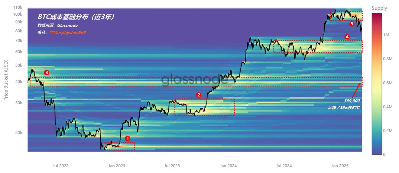 尤其我们还能看到,在2022年4月BTC $39,000附近建仓的筹码,直到现在还拿着(图中标注3,36w枚BTC),无论是跌至$15,800还是涨到到$108,000,都不动如山。