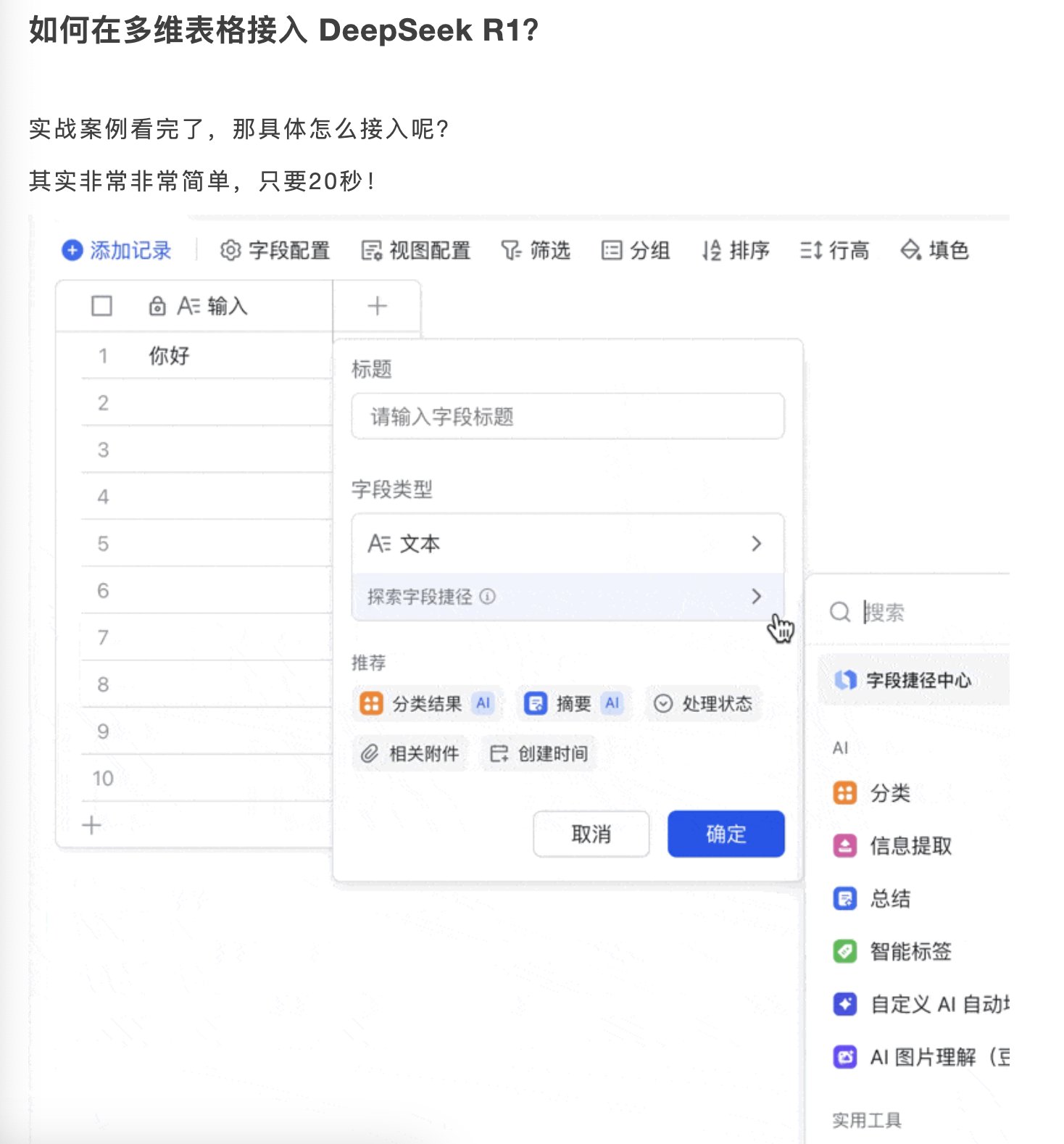 飞书多维表格+DeepSeek R1模板,10分钟搭出AI流水线