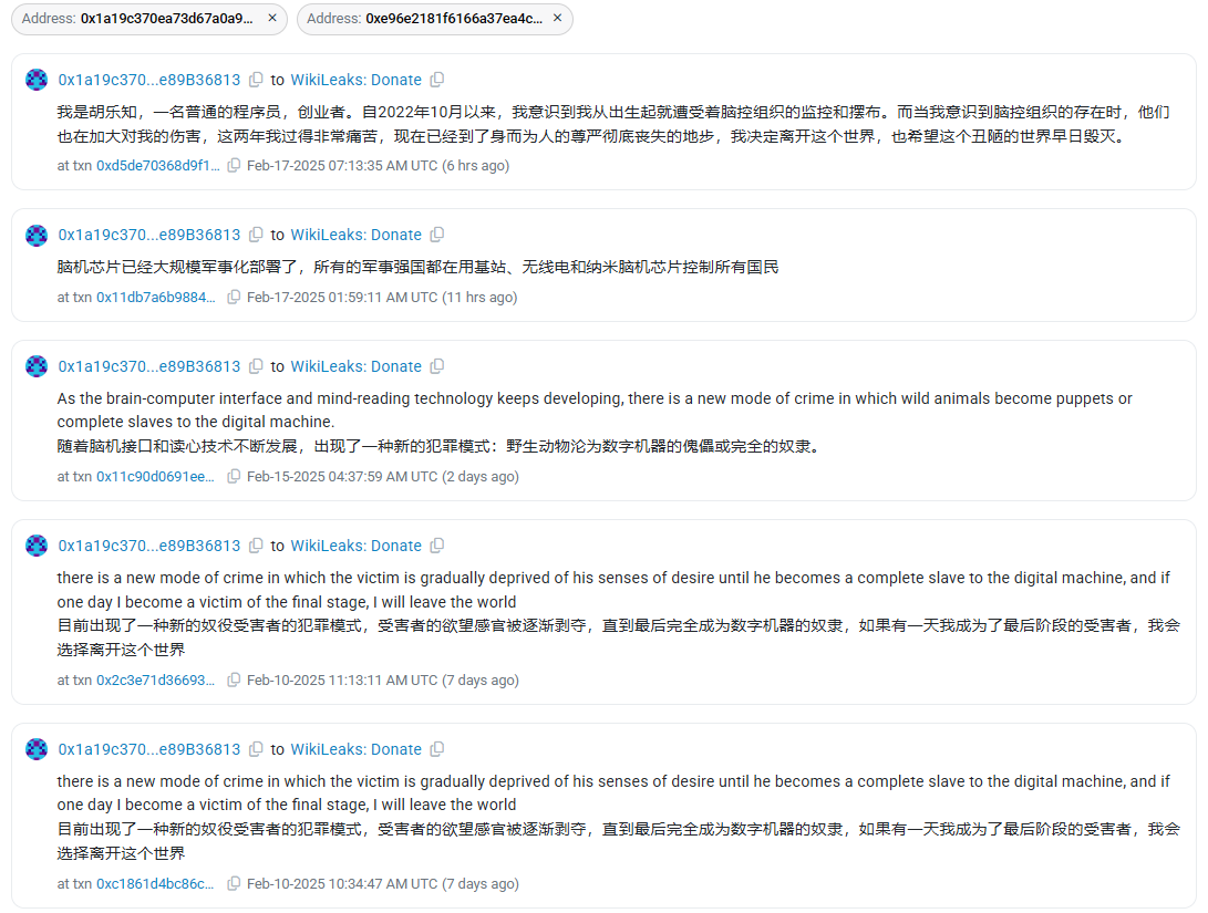 胡乐志:被指控遭受“脑机武器控制和迫害”的个人。在这次事件中,他通过区块链交易展示了一种抗议或警示的方式。胡乐志首先销毁了500 ETH,价值约138万美元,随后还向多个非政府组织(NGO),包括维基解密(WikiLeaks),捐赠了超过1000 ETH。