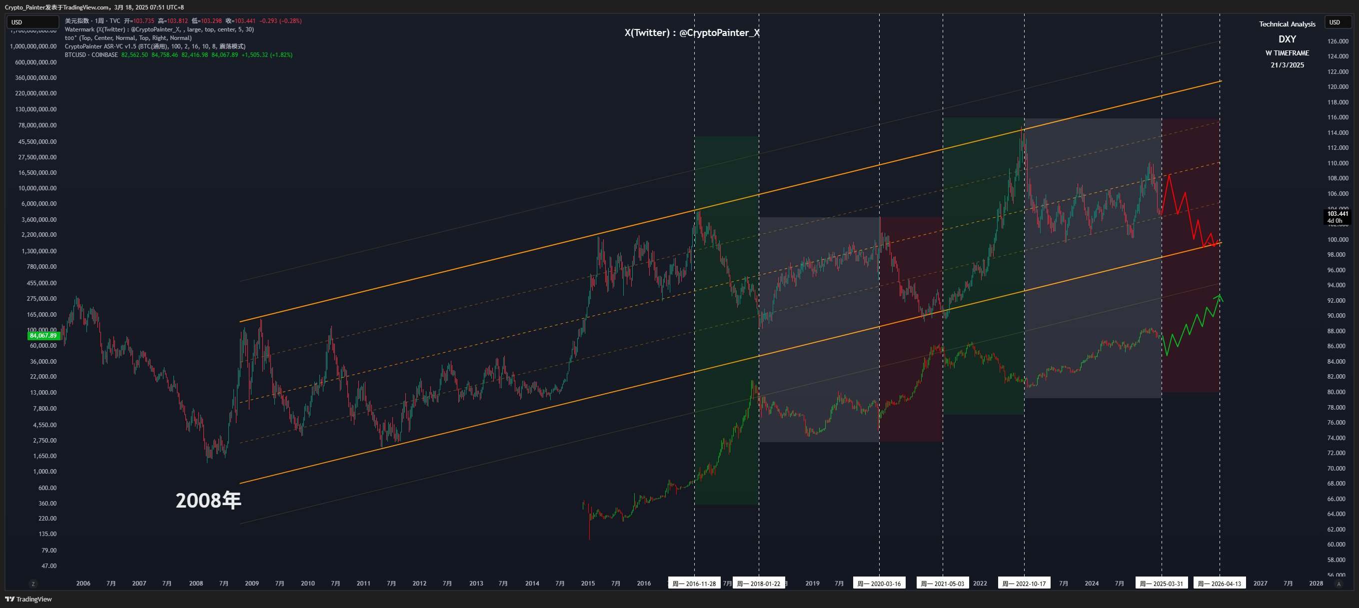 如果降息的路径没有转为加息,那么可以预见的未来,DXY依旧会去测试通道下沿,而这就对应了BTC的流动性牛市;