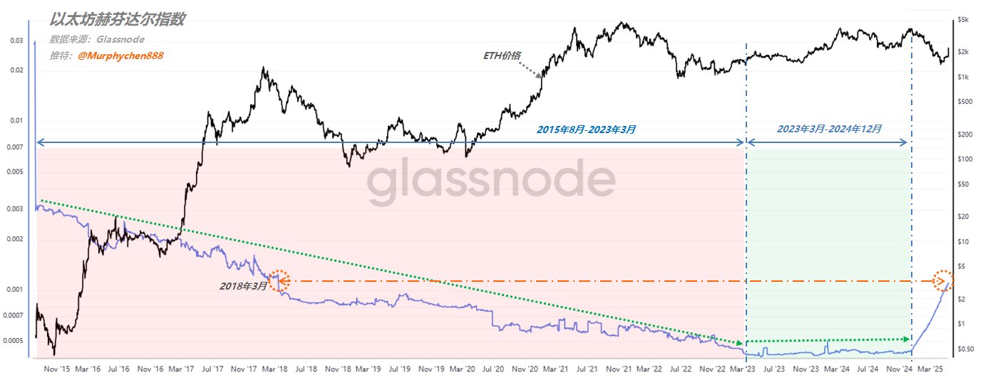 🚩第三阶段:2024年12月至今,赫芬达尔指数从底部开始快速上升,目前已达到2018年3月时的同等高度。可以说是仅仅只用了5个月的时间来归集,就完成了曾经走了5年之久的分散之路。
