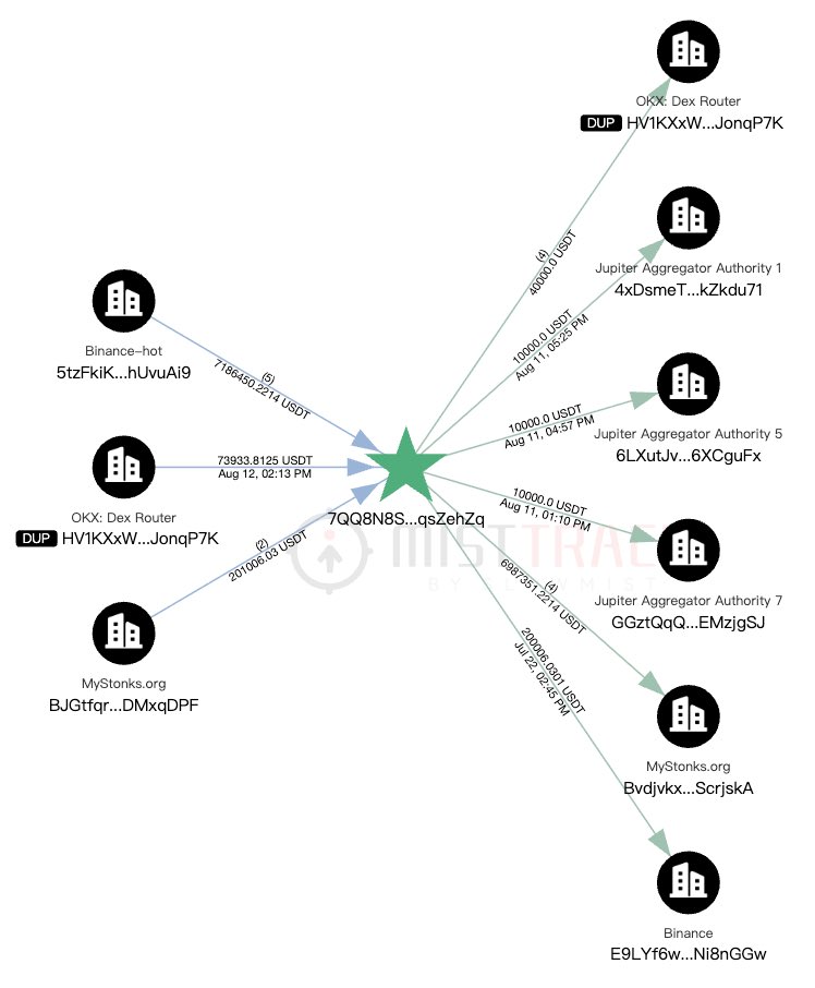 我们收到目标用户请求,初步看了下,如图是目标用户在 MyStonks 被冻 620 万刀的来源 USDT 情况,绿色五星图标 7QQ8N8S 是用户自己的 SOL 地址,大资金都来自 Binance 提币,DEX 交互都是 $STONKS 和 USDT 兑换有关。