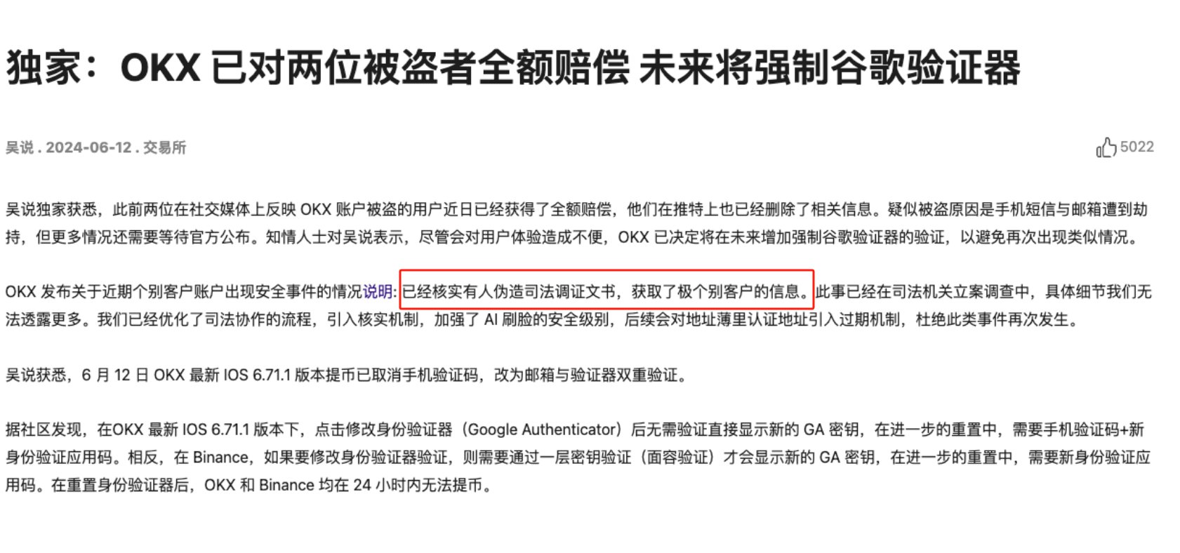 4. 已经核实有人伪造司法调证文书,获取了极个别客户的信息。此事已经在司法机关立案调查中,具体细节我们无法透露更多。我们已经优化了司法协作的流程,引入核实机制,加强了AI刷脸的安全级别,后续会对地址薄里认证地址引入过期机制,杜绝此类事件再次发生。没有再出现任何新的用户账户被盗或者信息泄露的案例。