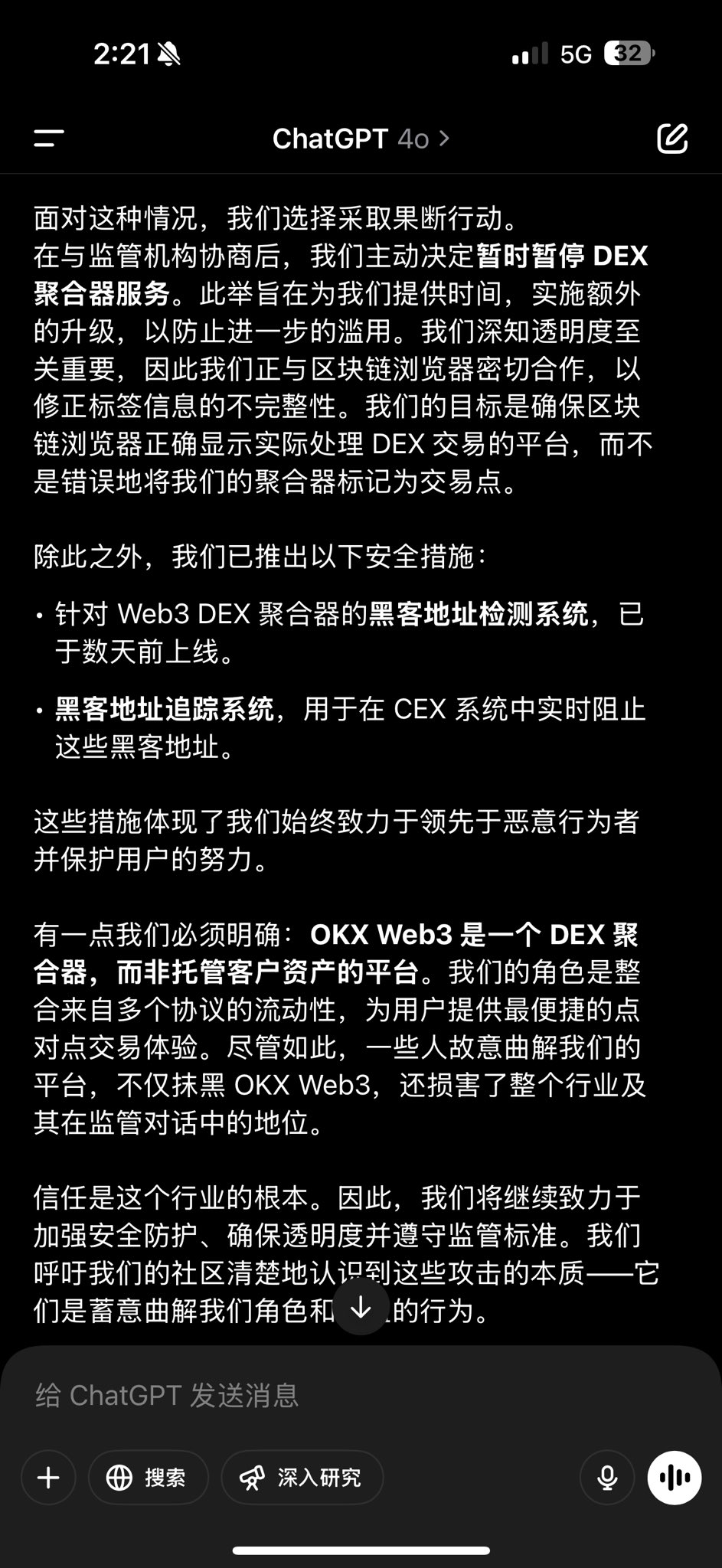 首先,我不担心OKX DEX会长期关停,应该会很快恢复正常服务。
