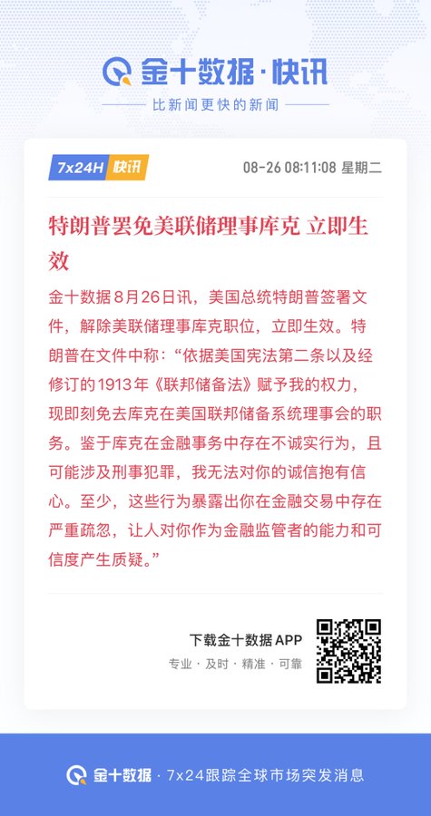 Phyrex@Phyrex_Ni于下午4:16 · 2025年8月26日 美国总统是否有权力罢免美联储理事? 北京时间8月26日早晨8点02分,川普签署了罢免美联储理事库克的文件,有些小伙伴说下跌是因为这个原因,从时间来看,虽然早晨确实在这个时间段 $BTC 有最多2,000 美元的振幅,但应该并不是主要下跌的原因,主要下跌还是在今天凌晨美股加大下跌力度的时候,大概是凌晨3点30分开始的。 当然小伙伴的分析是对的,川普直接对美联储理事下手会让外界对川普的权利质疑,如果总统能随意罢免美联储理事,那就意味着所有不听川普话的都会被罢免,从而担心美联储的独立性,但实际上不用担心。 大概三个小时以后,被罢免的美联储理事库克就发表声明说川普没有罢免他的权力,他自己也不会辞职,那么美国总统是否有权力罢免美联储理事呢? 答案是肯定的,总统确实是有权力罢免的,但必须要有足够的理由。 这次签署的罢免书中,川普的理由是声称库克涉嫌“抵押贷款文件造假”,这和联邦储备法规定的是一致的,但前提是需要经过司法审查并且确定后才可以罢免,也就是说现在川普确实没有权力去解除库克的职位。 只有在法院调查后认定了库克确实坐实了“抵押贷款文件造假”,那么川普才可以动用总统的权力去解除库克的职位,这事川普知道吗?我想他一定是知道的,但如果川普明明知道不能这么做,那么川普为什么还这么做? 真相只有一个,留给川普的时间不多了,川普在美联储内部获得的支持仍然不够多,所以川普需要用这样的行政命令手段来给美联储内部施压,如果美联储不能进入连续降息环节,所有不支持降息的理事可能都会受到川普的调查,一旦屁股不干净,那么就会受到川普的解雇。 确实,川普在干扰美联储的独立性,但这种独立性的干扰,如果是在以前,可能是大大的扣分,但是在现在,可能真说不好了。