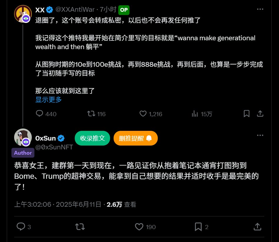 2025年6月11日凌晨,女王官宣退圈,原因是在当下的市场中,她钟爱的重仓玩法,已经不适用了,基于对于市场的尊敬,她选择及时离场。