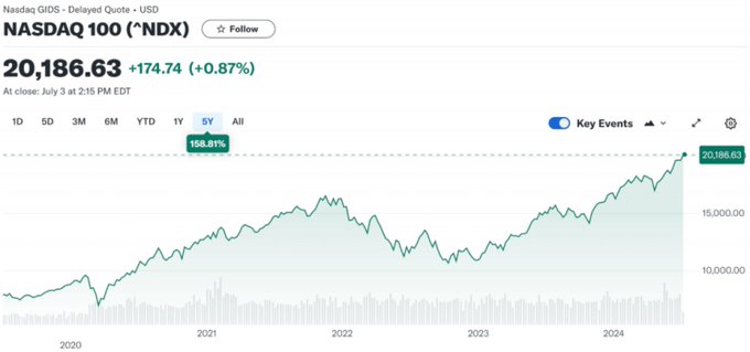 附:过去五年,美股纳斯达克100指数和中国发行的纳斯达克100指数基金513100的价格波动。可以看到,他们的走势非常接近。