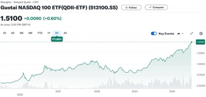 — 标普500指数。比如博时标普500ETF,代号:513500。这个对标的就是美股的VOO或者SPY等标普500指数ETF。该基金成立于2013年,每年的管理费和托管费总计0.85%。2024年7月,该基金的规模为120亿元,比去年增长了50%,可见更多的大陆投资者在投资美股。