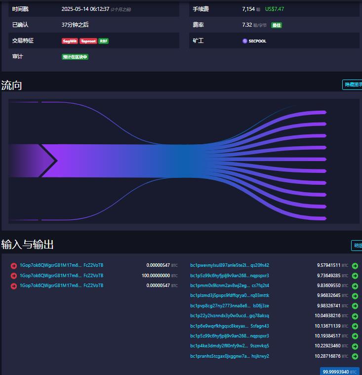 bc1pwevnylxul897anle5te2l3n3akmv2nmmdngnentycagcurcztkqs20fn42接收了9.57941511 BTC。bc1p5z99c6hyfjplj9v9an268uec8kv6m9zmxlg4u48yt0r2u4accfnqpspxr3接收了9.73649285 BTC。bc1pmm0x9lcnm2av8wj2egvsfjpwlggx8xmaw5d50emaltjudyayc5cs7fq2t4接收了9.83609550 BTC。bc1plzmd3j5pxps9fdffqrya03mttk接收了9.96832645 BTC。bc1pvp8cg27ny2773nna8e66jt3rfe0g0s26ukgjj9gdnpl42g53efls06j3ze接收了9.98326741 BTC。bc1p22y2lvznndx3y0w0ucdagh5ztsc6v86s0e2q37tqvycetlqex3gq78aksq接收了10.04938216 BTC。bc1p6e9wqrfkhgqsc8keyaxwurdq3ut3fplvgxgxzznnak6vny80645sfagn43接收了10.13671139 BTC。bc1p5z99c6hyfjplj9v9an268uec8kv6m9zmxlg4u4accfnqpspxr3接收了10.19384517 BTC。bc1p4ke3dmdy2fll0nfy9w28fwzkahfgfjajzk2zanklzqcexnj0329sznvkq5接收了10.22923460 BTC。bc1pranhs5tcgax0jxggnw7awwnyg2ugjygpp7ym420zevaqk82rdlhsjkrwy2接收了10.28716876 BTC。- 可以看到,这 100 BTC 的大额输入,最终被拆分成了 10 笔金额相似的输出,分配给了 10 个不同的 Taproot 地址。这很可能是一笔分发交易,比如大户进行资产分散,或者某个机构向多个接收方进行支付。