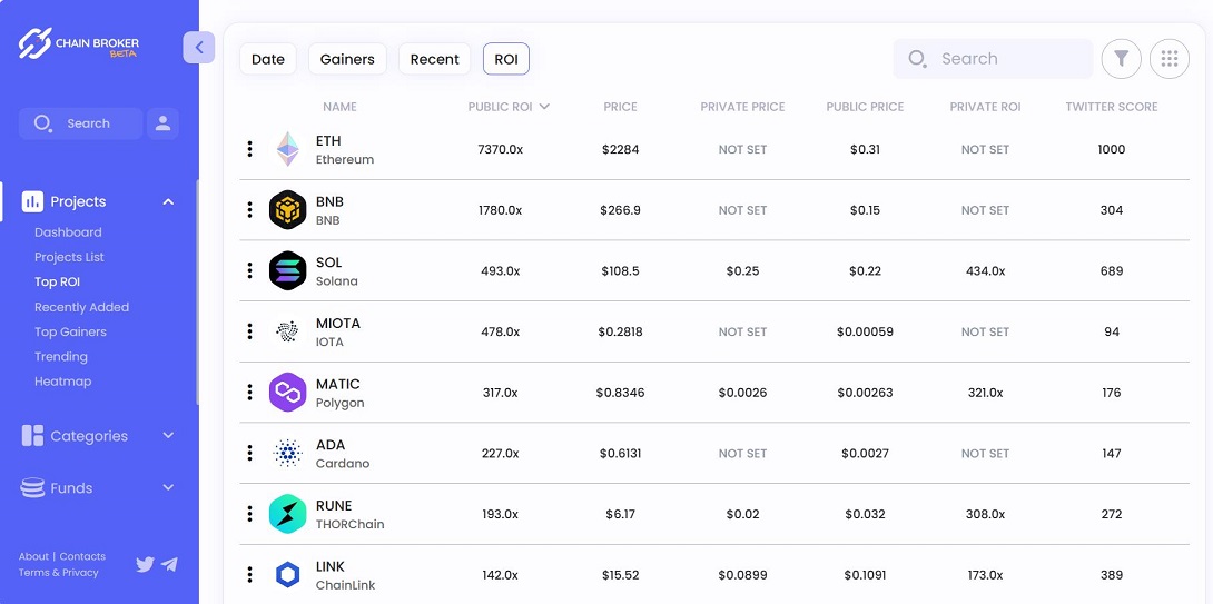 加密货币项目信息:提供每个加密货币项目的详细信息,包括项目介绍、代币信息、团队信息、投资信息等。支持根据Date、Gainers、Recent、ROI对项目进行排序。
