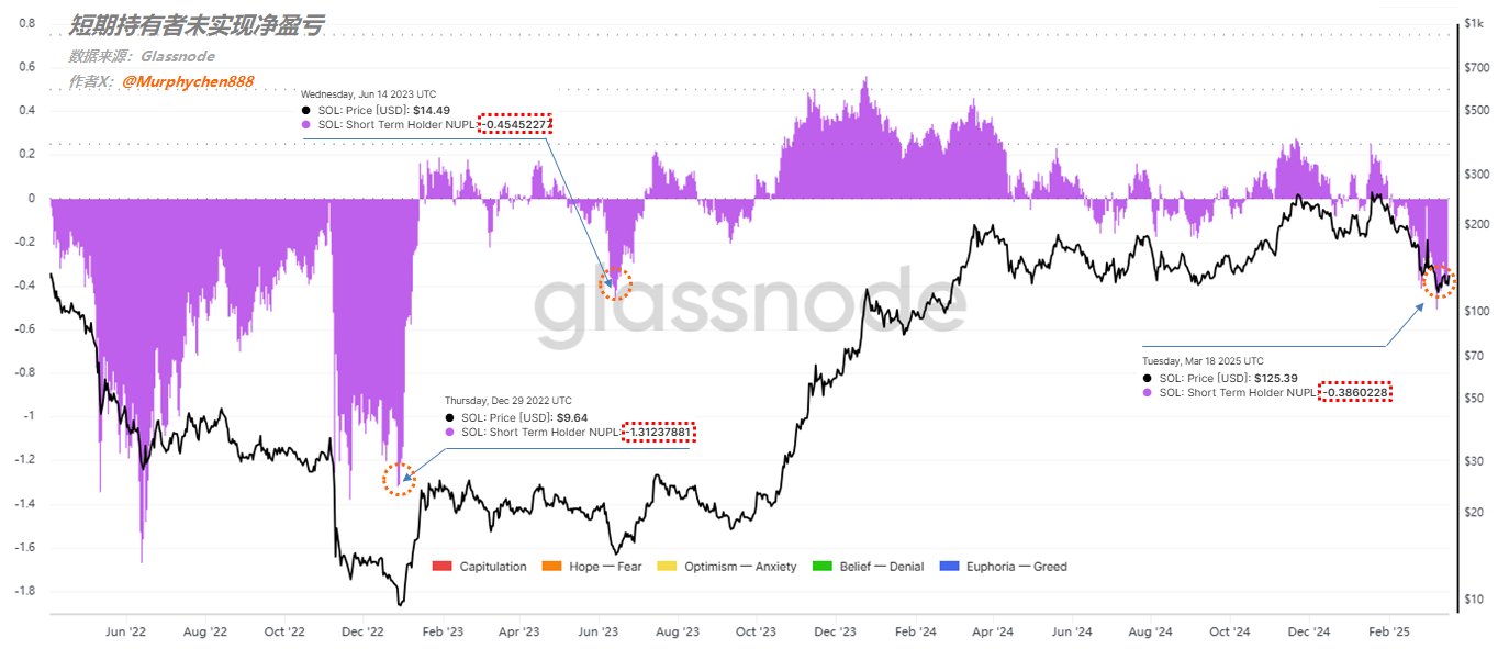 可以说当前短期持有者财务压力较大,情绪焦虑,这会无形中放大SOL价格的波动性。例如在22年11-12月期间,由于FTX暴雷对SOL产生严重影响,当时STH-NUPL最低至-1.3,这是极其罕见的现象。说明STH严重亏损,情绪极度恐慌,也引发了异常剧烈的价格波动。