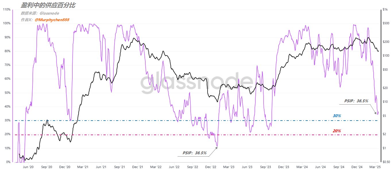 例如,在22年12月-1月期间PSIP甚至跌破20%,最低至11.5%。近90%的筹码都亏损,这种匪夷所思的极端现象意味着SOL要不归零,要不这里就是铁底了。