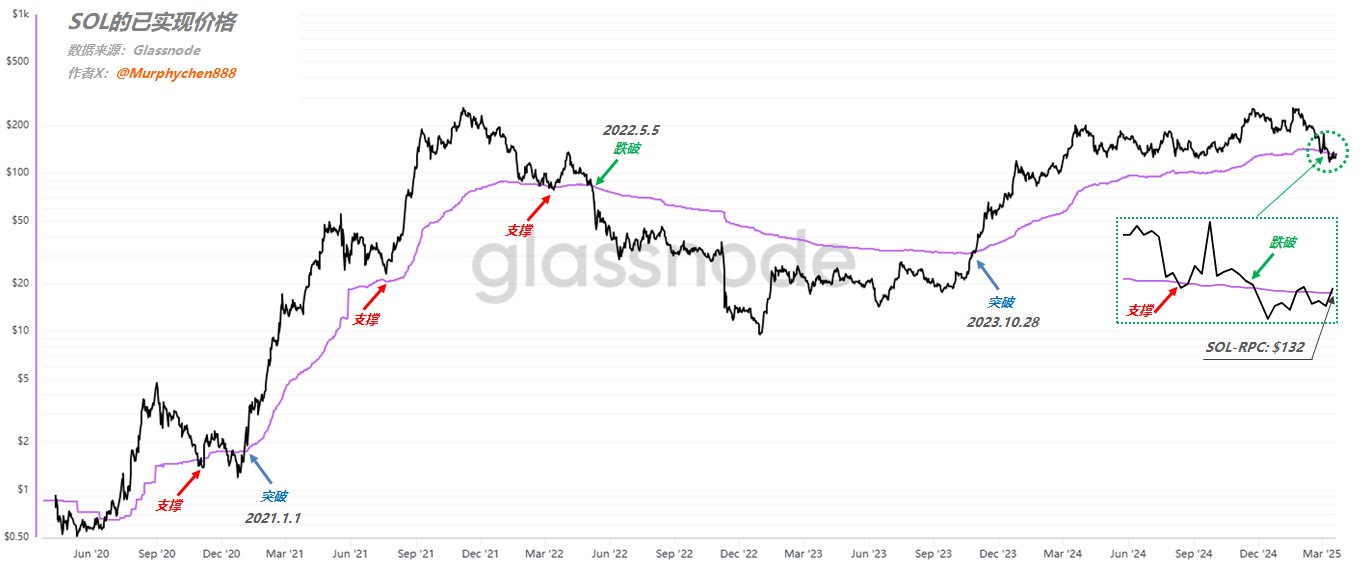 3、当前SOL-RPC在$132,表示投资者平均换手成本是$132;这对SOL来说可以视为牛熊分界线;在历史上一旦跌破这根线且无法重现站上,SOL都将进入一个漫长的“熊市周期”。
