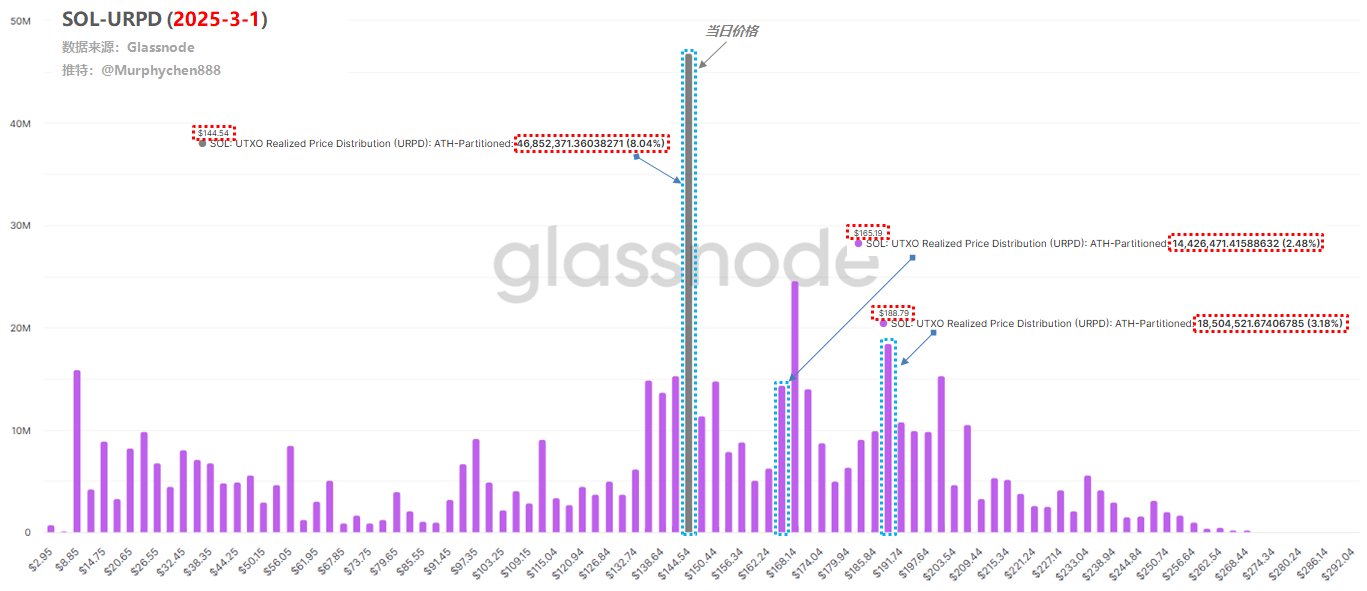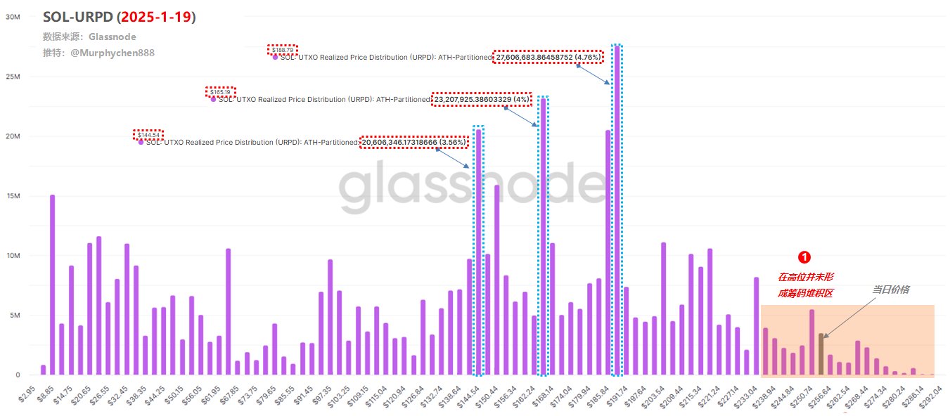 图1是2025.1.19的URPD数据;在整个筹码分布图上可以明显看到有3根巨量柱,分别是$188(2760w枚SOL,占总流通的4.76%),$165(2320w枚SOL,占总流通的4%),$144(2060w枚SOL,占总流通的3.56%)。