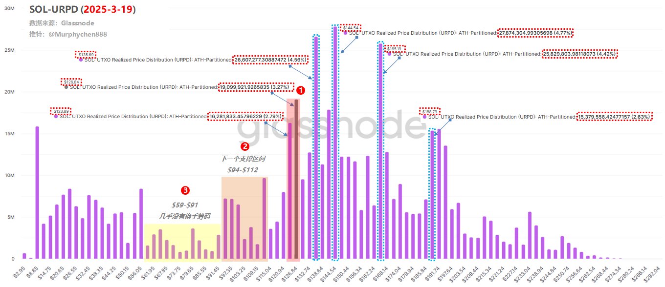 在上一章节我们讲到SOL-RPC是$132,从图3看价格已经低于这根“生命线”了,落在$123-$126这个区间(标注1),这也是SOL筹码结构上最后的强支撑位,再往下就没有巨量柱和筹码堆积区了。只有1个较弱的区间在$94-$112左右(标注2),而$59-$91几乎没有筹码(标注3),应该都无法形成支撑效应。