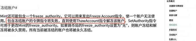 而Solana上绝大多数开发者使用的是官方合约“TokenProgram”。但是查阅开发文档,我们可以清楚地看到官方合约中有一个功能:Freezing accounts ,为了方便大家阅读,翻译成中文。