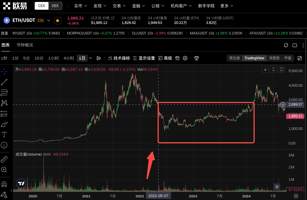 你看这个线刚插下来没多久吧,还得再等两个月,等下一个稳定币暴涨的时候就是右侧交易的时候