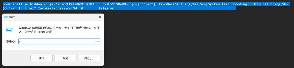 此时你的剪切板已经偷偷地被植入了恶意代码内容,如图4,如果你真的按指南打开了运行框,并 Ctrl + V 把恶意代码内容黏贴进运行框里,此时的状态就如图4这样,你在运行框里并看不到全部内容,一大片空白的前面是 Telegram 字样及恶意代码,这是一段 Powershell 指令…