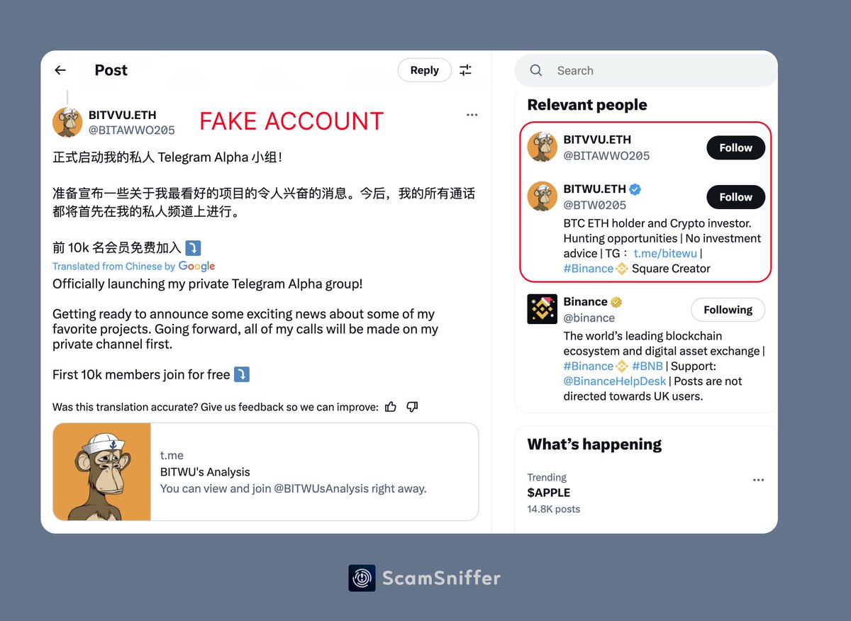 这里说说第一种植入木马情况,非常恶劣,非常猥琐。这里拿 @BITWU.ETH 的评论区出现的 Scam account 来解读下。注意仔细看这里是假冒比特吴的账户。