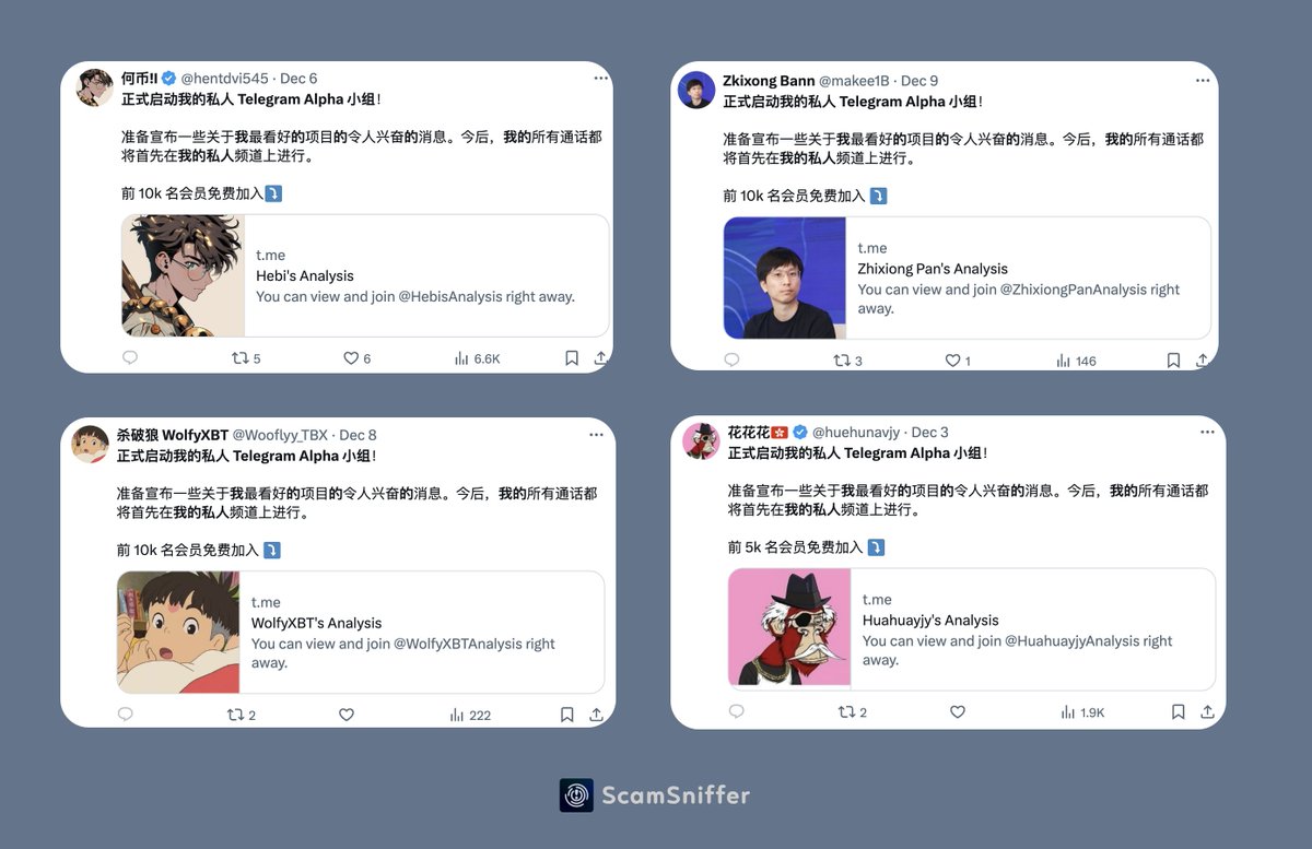 首先,诈骗者会模仿热门加密货币影响者创建虚假账户。他们会对合法帖子发表评论,邀请用户加入“独家”Telegram 群组,承诺提供 alpha 和投资见解。