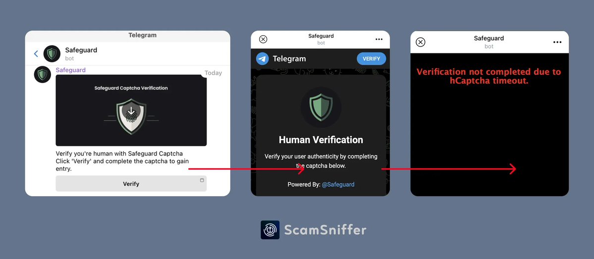 一旦进入 Telegram 群组,用户就会立即被提示通过 OfficiaISafeguardBot 进行验证。这个假机器人通过极短的验证窗口制造出人为的紧迫感。🕒
