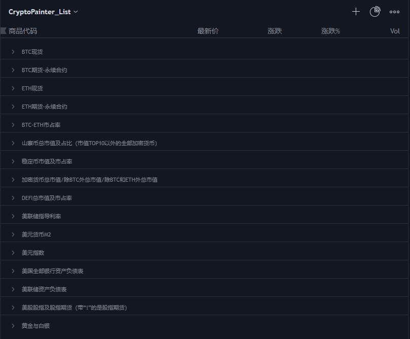 还有稳定币市值、市占率、山寨币市值、市占率、Defi市值及市占率、美联储利率、美元货币M2、美元指数、美国银行与美联储资产负债表、美股股指及股指期货、贵金属的大部分商品交易对;