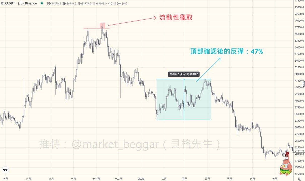 在顶部确认后的熊市区间,价格也出现了高达47%的反弹幅度。
