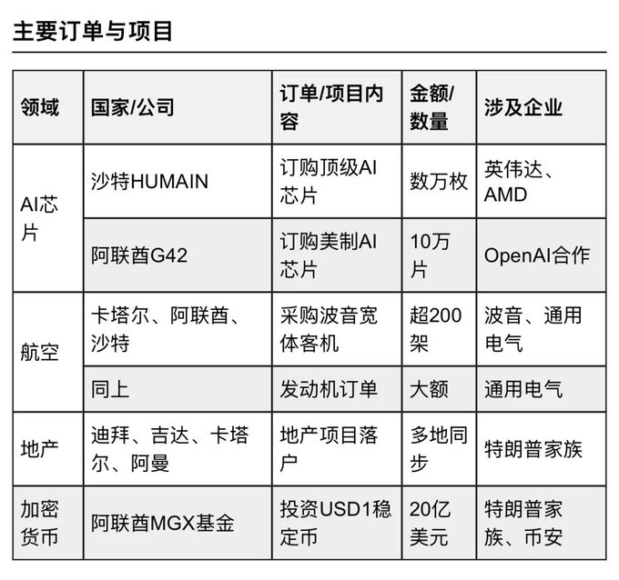这些相当于推动中东这三个产油国向未来AI算力数据中心转型,美国AI需要基础设施支撑特别是电力支撑,那就让沙特和中东国家解决,把沙漠里铺上太阳能电池板电力供给就不是问题了。