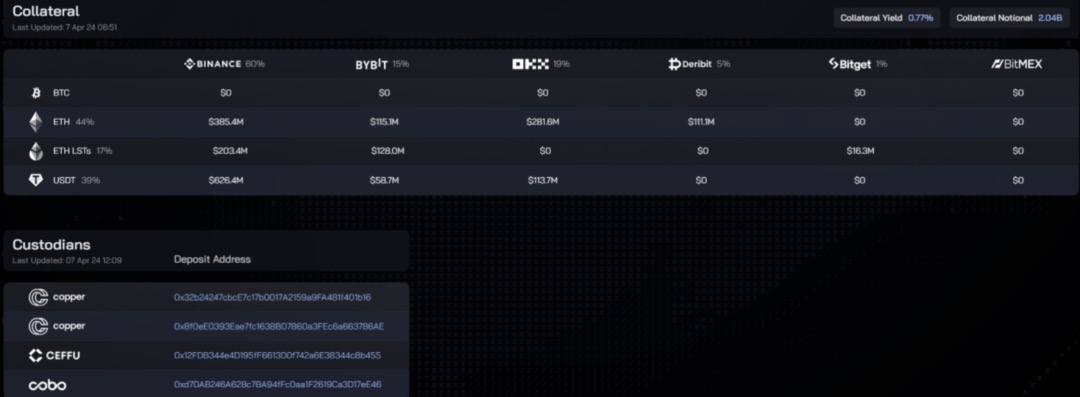我们回到Ethena,关于是使用交割合约还是永续合约我并没有在官网找到准确界定(考虑到交易深度问题,永续合约的概率比较大),但公布了抵押物的链上地址和CEX分布。