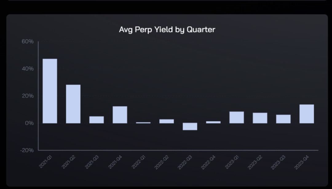 从短期来看,这两种方式会有一些差异,交割合约会提供一个更加“稳定且可预测”的收益率,且到期收益始终为正。而永续合约则是一个波动利率的产品, 日利率在特定情况下也可能为负。但从经验来看,永续合约的套利历史回报会略高于交割合约,且二者都为正: