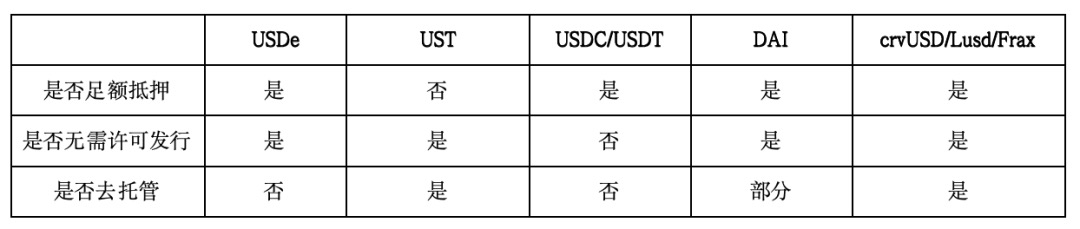 基于此,我们可以剥离掉过于复杂的分类,抽象成是否有足额抵押、是否无需许可发行、是否去托管三个核心指标。对比来看,USDe和其他常见稳定币在这三项属性上均有部分差异。如果我们认为【去中心化】需要同时满足【无需许可发行】和【去托管】两个条件,那么USDe是不符合的,因此将其归类为【足额抵押的半中心化稳定币】是合适的。