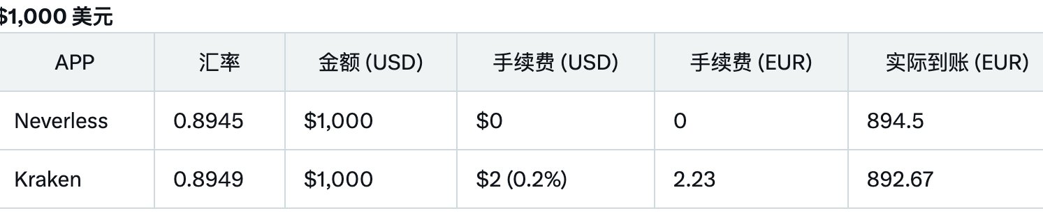 0交易费用,也就是usdc兑换法币免费。免费的午餐都不好吃,那么就要考虑汇率是否友好了,很多号称免转账费用或者手续费的,其实隐藏磨损都在汇率里(比如U 卡)。整理了下当天的美元兑欧元汇率,kraken:0.8949, neverless:0.8945,两者差别不大。我们以1000u为例,看最终到手欧元的数据: