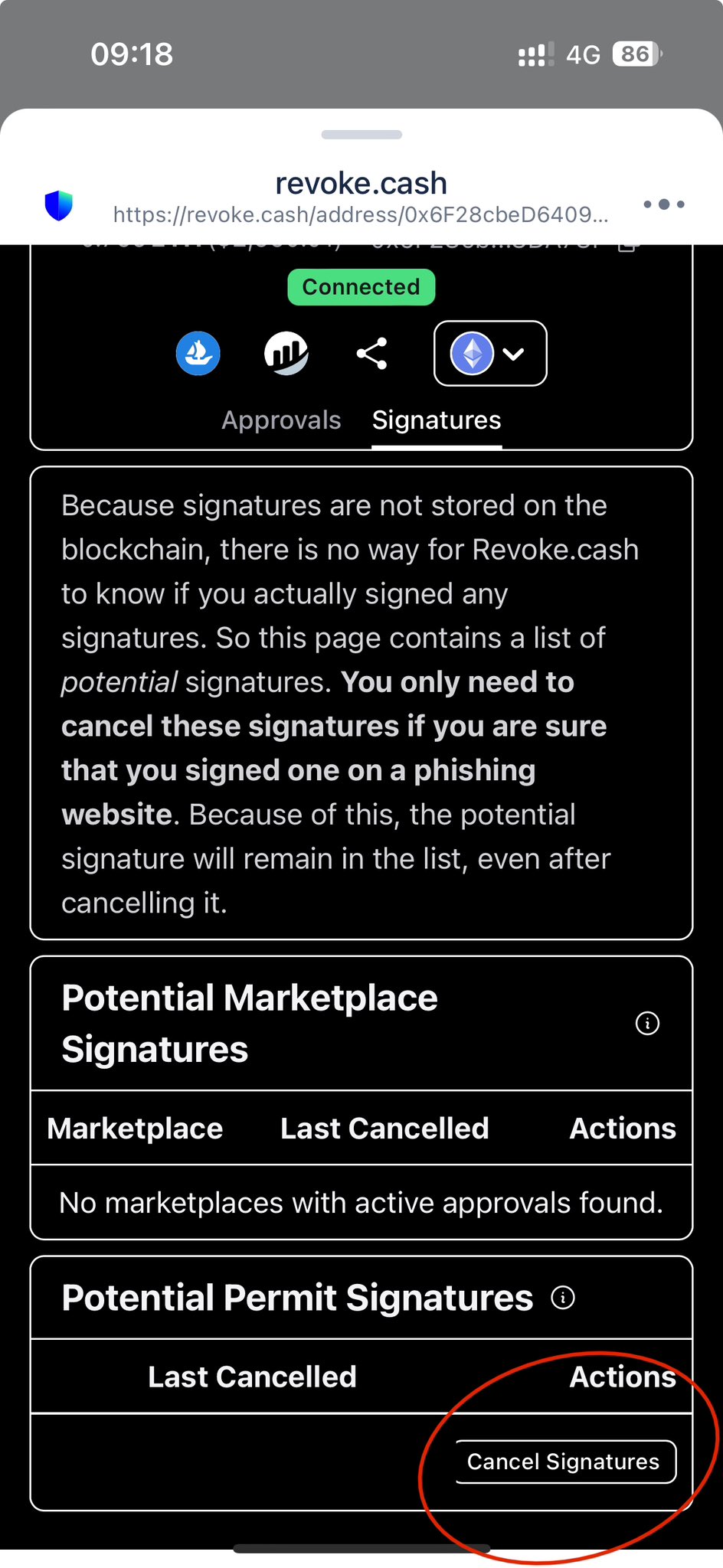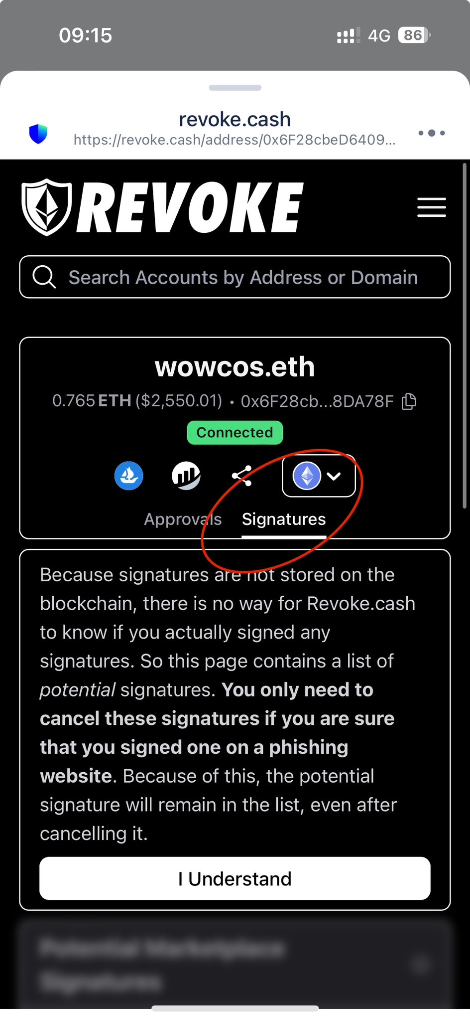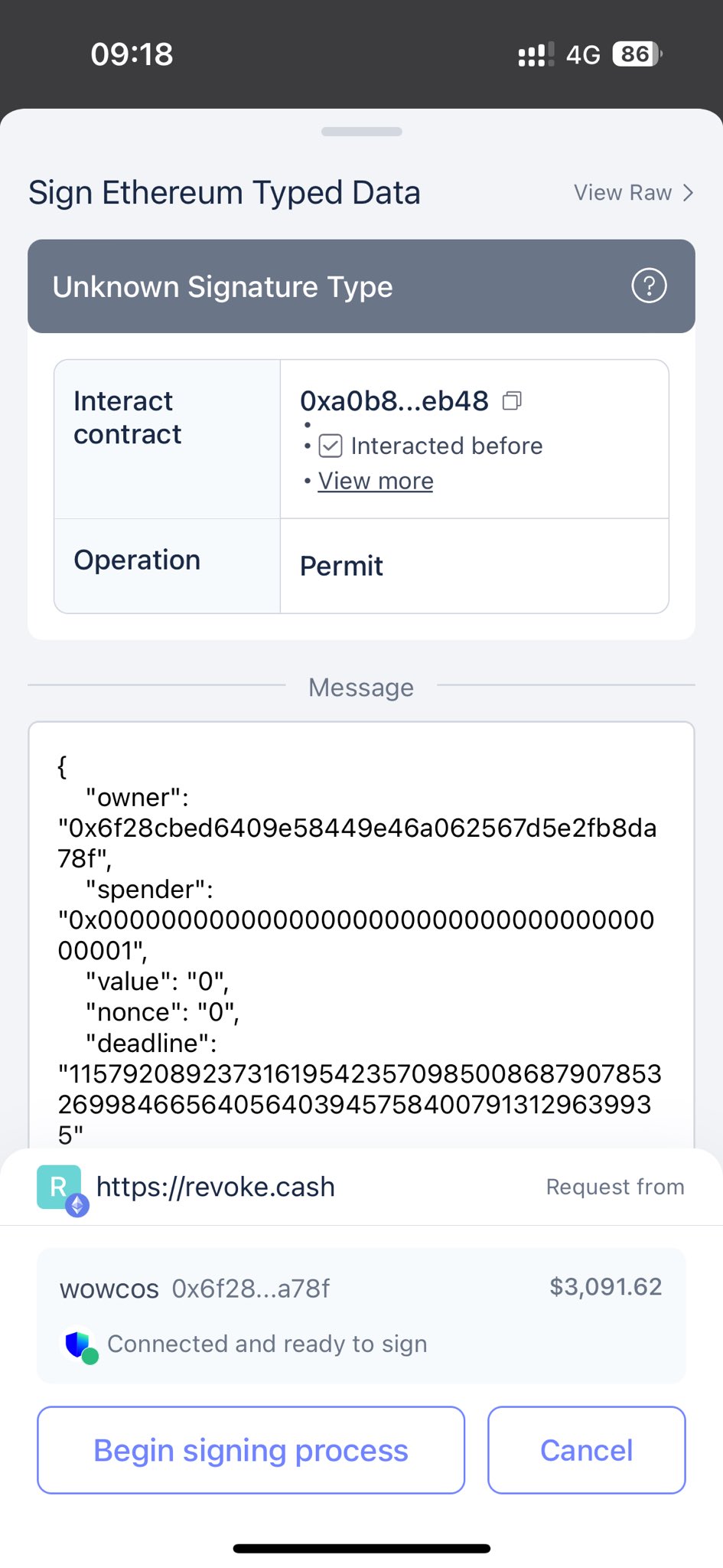 其实很简单的,之前我说过,不过可能懂技术细节才更好理解,否则只需这样做:用 Revoke 检查授权时,还有个 tab 是签名检查,把怀疑可能被钓走 permit 离线授权签名的资产都取消下签名即可,如图我在取消我的 USDC permit 签名。注意下,这个取消功能一直会存在,这只是方便用户将之前不小心被钓走的 permit 签名失效的一种小技巧,所以取消签名做一次即可。