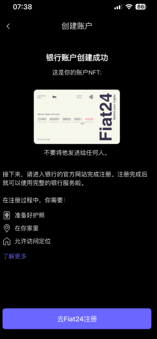 Fiat24 是一家 Web3 银行,与传统银行不同,Fiat24 并不以账号和密码作为银行账户凭证,而是以 NFT 作为银行账户凭证,因此铸造一个属于你的 NFT,相当于为你创造了一个新账户。对于银行资金的使用,是通过私钥签名来验证身份,而不是通过证书或交易密码来验证身份。