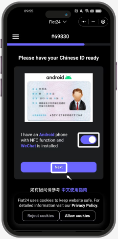 将您的身份证贴在你的手机背面完成资料采集和认证,采集过程中请不要移开您的身份证,等待完成。这个过程需要您的手机支持NFC功能并且已经开启NFC功能。