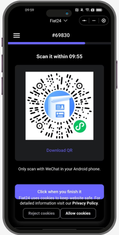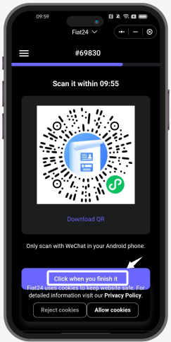 接下来 等待Fiat24确认。这时建议多等一会,毕竟第三方身份验证端要和银行端同步验证结果,并且保持网络畅通。之后回到SafePal App里面,点击 Click when you finish it 按钮。