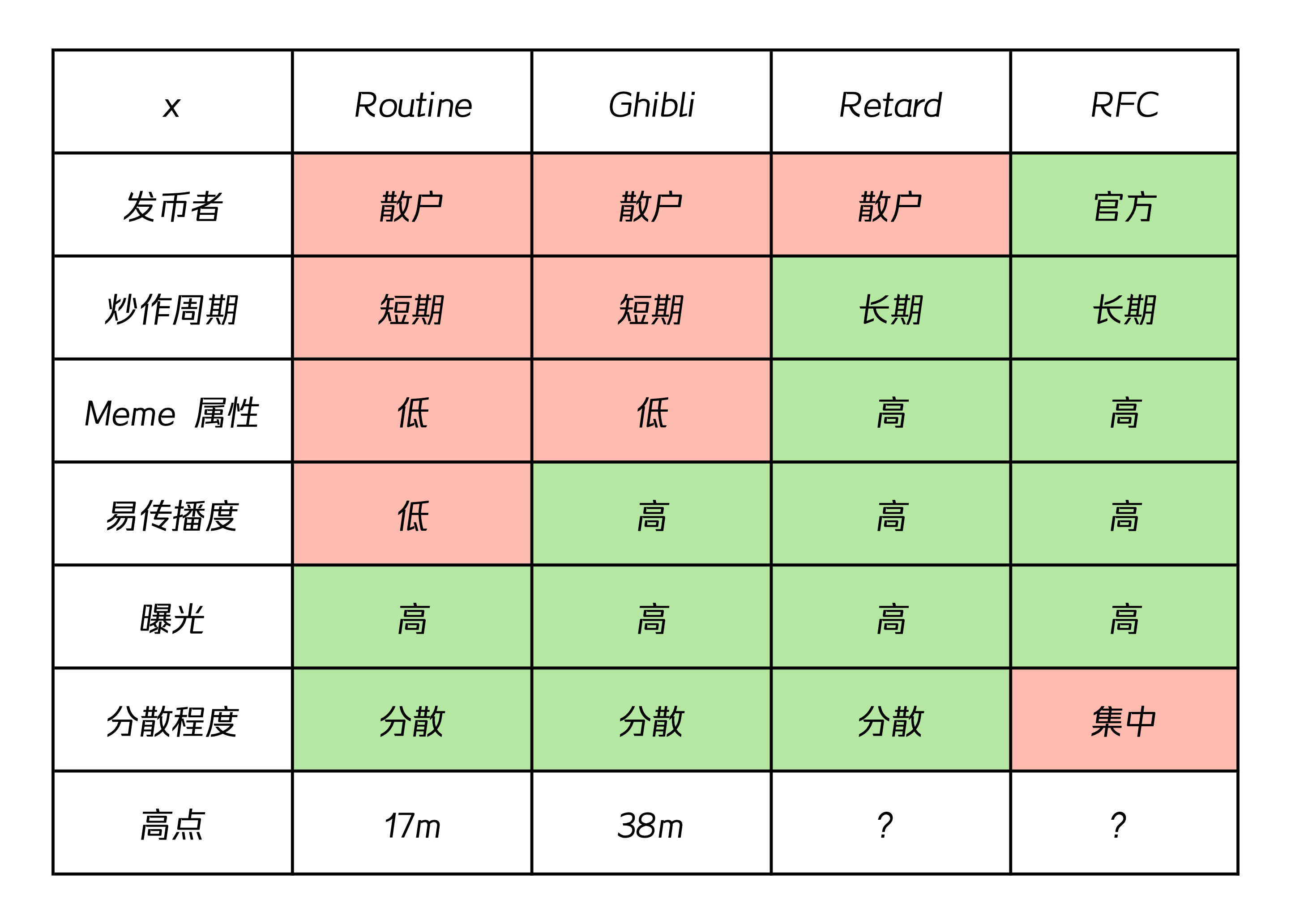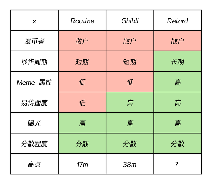 那时候的 Solana 刚刚出过了两个大金狗,分别是 #Routine 和 $Ghibli ,所以我简单地从 6 个维度去对比了他们三者之间的属性👇