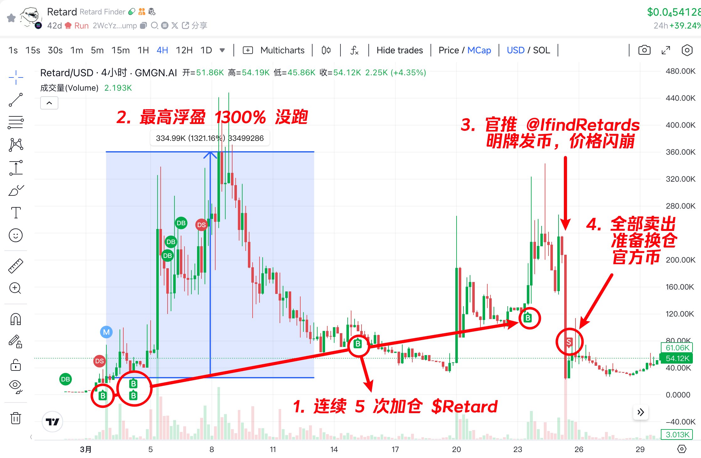 当时对比完之后就觉得 $Retard 这个币简直太完美了,简直是先天 Memecoin 圣体,我直接原地 fomo 了,前前后后对 $Retard 进行五次加仓,这个币我中间最高浮盈到了 1300% 我也没有卖,因为只有 300k 市值,当时觉得 #Routine 和 $Ghibli 都能到 17~38m,这个 $Retard 就算表现再拉不也能摸个 5~10m。