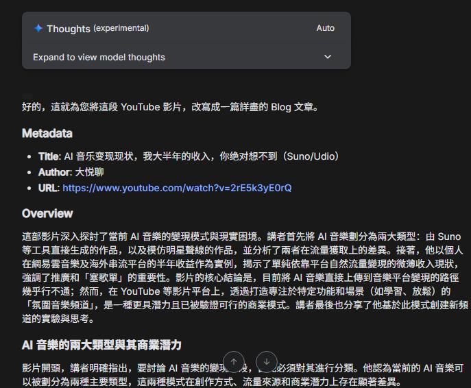 首先我们利用作者@Jiayuan@tisoga最近优化的这个新的 Youtube 总结的 Prompt,搭配谷歌的AIstudio就可以彻底来「阅读」Youtube 视频了。注意:gemini是无法读取视频内容的。