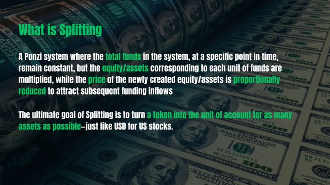 拆分盘是一种庞氏系统,其总资金在某一特定时间点保持恒定,但每单位资金对应的权益或资产数量被成倍增加,同时新生成的权益或资产的价格按比例降低,以吸引后续资金流入。这与传统金融中的股票拆分极为相似。