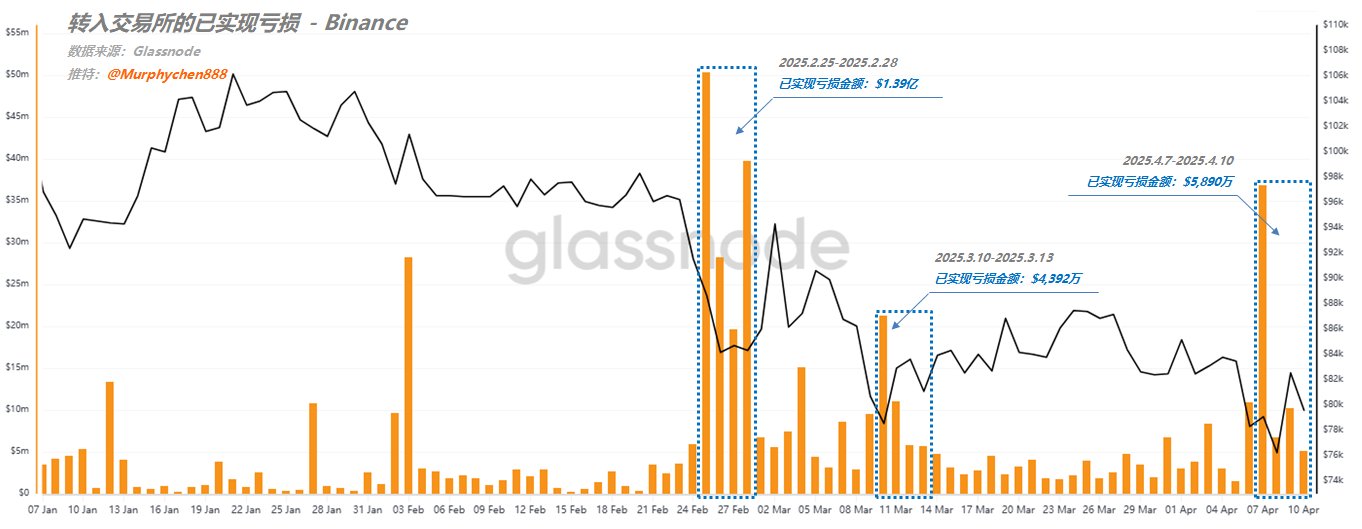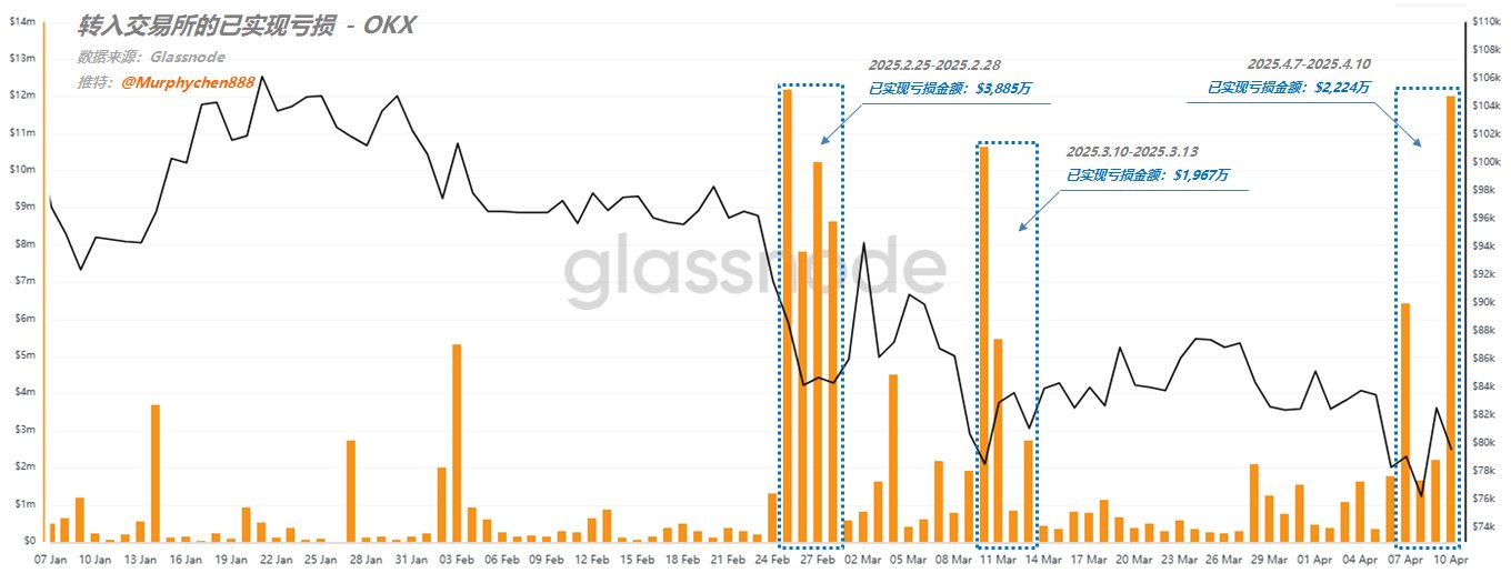 “转入交易所的已实现亏损金额”是衡量市场投降程度的重要量化指标之一。我主要以Binance、OKX与Coinbase三家头部交易所的数据作为参考依据。因其流动性更好,能承接大额资金的进出,从而更真实地反映市场情绪变化。