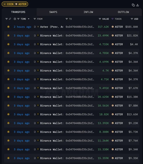 Ai 姨@ai_9684xtpa 有一说一,嗯哼的确通过「相信的力量」在 $ASTER 上赚了不少 ▶︎ 过去三天他以均价 $0.8375 在链上买入 17 万枚代币,投入 9.5 万美元,这部分已浮盈 12 万美元 ▶︎ 两小时前又从 Aster 提出 31.7 万枚代币,五天前充值了 9.8 万刀进去,现在提出来 50.2 万刀,如果是全买了 ASTER 回报率也有 5 倍多 所以目前共持有 48.7 万枚 ASTER,累计 77 万刀;至于嗯哼到底有没有 A9?链上单个地址的持仓是 86 万刀,剩下的就要问本人了🤪 钱包地址 https://intel.arkm.com/explorer/address/0xD47044Bbf35c26f419404794a67516A7C53ca549