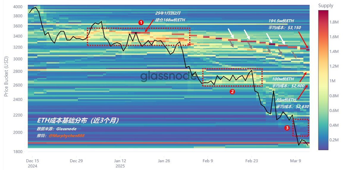 我们再看标注2红色虚线框中也有一段筹码堆积区,总体规模要小于上面的那个,它们是在25年2月中旬建仓的筹码,成本大致在$2,600到$2,800之间。但随着ETH价格跌破$2,300开始割肉减仓,到目前为止卖了不少,只有$2,800和$2,630这2个价位的筹码还没动,分别持有有100w和85w枚ETH。
